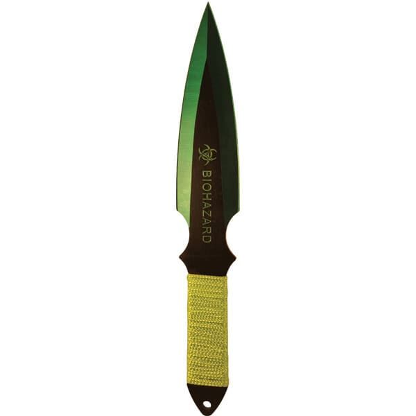 2 Piece Throwing Knife BioHazard. 9″ Length, 2 Piece Set, made from 440 stainless steel, great beginner to intermediate throwing knife. Includes sheath pouch for knives.
